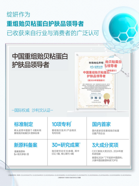 为验证产品功效与安全性,绽妍联合第三方权威机构完成1500+人体功效实证,与四川大学华西化妆品评价中心、SGS等机构发布多篇循证文献,重组贻贝粘蛋白获得2000+皮肤领域专业人士的高度认可,成为医生推荐的优质修护成分。在技术成果转化与行业标准建设上,绽妍同样表现突出。目前已斩获10项发明专利及1项美国专利,牵头起草《敷料用重组贻贝粘蛋白》团体标准,完成化妆品新原料sr-贻贝多肽-3备案,30+研究成果涵盖核心期刊论文与ESCI收录文章,用技术定义行业标杆,推动整个行业向规范化、科学化方向发展。
