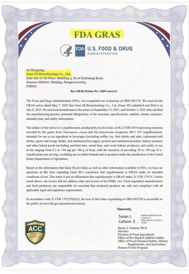 标题:150mg最高获批剂量!GeneIII仅三麦角硫因获FDA GRAS认证,消费健康新标杆