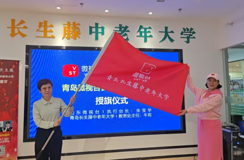 在授旗仪式环节,山东微视台执行台长朱宝华将象征使命与传承的“校旗”授予青岛微视台长生藤中老年大学,由教务处主任牛莉郑重接旗,寓意着这所新型中老年学府正式扬帆起航。