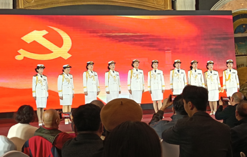 在艺术团团长李翔宣布“庆典演出正式开始”后,四位主持人贾凤青、高卫兵、张书宝、张艳萍、精神焕发地登台。他们以铿锵有力、饱含深情的开场词,瞬间点燃了全场热情。