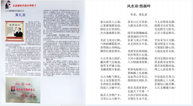 四十载研易路,黄礼家以好奇为引,以实践为基,以创新为翼,在易学风水的天地里开辟出一片崭新的疆域。他的人体风水理论,让古老的风水智慧有了具象的依托;他的《悟画吟》,让深奥的学术思想化作朗朗上口的诗篇。从乡村规划到文化传播,从理论建构到行业引领,他始终坚守初心,致力于让风水文化摆脱迷信标签,回归其蕴含的自然规律与哲学智慧。黄礼家说“传统风水理论如同参天大树,永远都是人体风水学最坚强的根基,《悟画吟》和《悟阴阳》都只不过是其中一片技叶而已,完成创作的路很远,对《悟画吟》的解释还依然在继续中,希望同行的专家学者对《悟画吟》和《悟阴阳》的不足提出主贵意见”