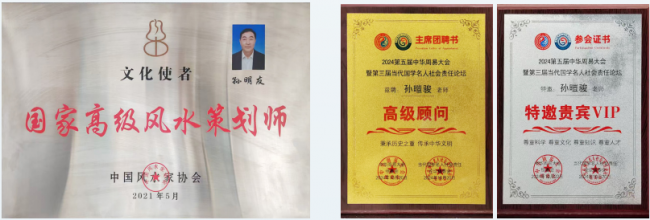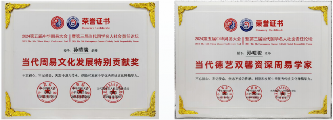 凭借在易学领域的深厚造诣与“五行旺运”技术的独特价值,孙暟骏逐渐获得了行业与社会的广泛认可。在2024年举办的第五届中华周易大会暨第三届当代国学名人社会责任论坛上,他凭借对周易文化的深入研究与实际贡献,荣获“当代德艺双馨资深周易学家”称号,其研发的“五行旺运”技术也荣获“当代周易文化发展特别贡献奖”;同时,他还被聘为大会的高级顾问和特邀贵宾,成为行业内备受瞩目的专家,受到同行和专家的一致好评。
