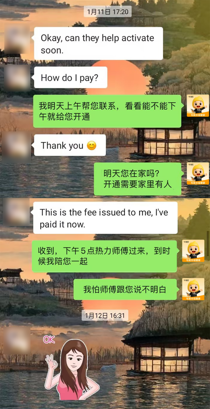物业团队在接到咨询后迅速响应,启动了一系列协助措施:管家通过微信,将开通与缴费的关键步骤翻译成英文,进行一对一细致指导;工程人员主动上门,为其检查供暖管道状况,预先排查可能存在的问题;同时,物业积极对接供热公司,协调确定上门服务时间,并承诺管家将全程陪同。