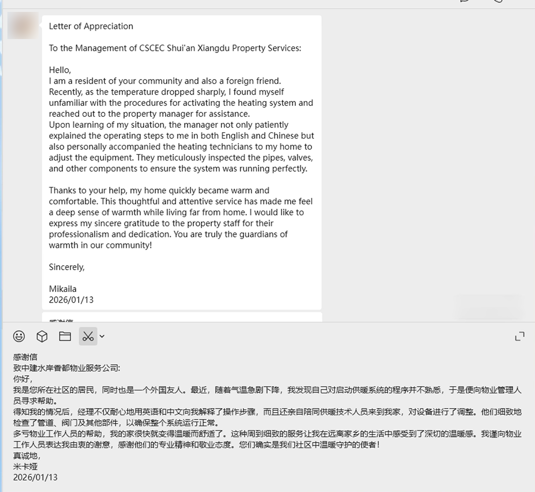 一周后,Mikaila将一封亲手书写的感谢信送到了物业服务中心。她在信中特别提到:“物业经理及管家不仅耐心地用英语和中文向我解释操作步骤,还亲自陪同供暖技术人员来到我家……这种周到细致的服务让我在远离家乡的生活中感受到了深切的温暖感。”她由衷地称赞物业团队是“社区中温暖守护的使者”。
